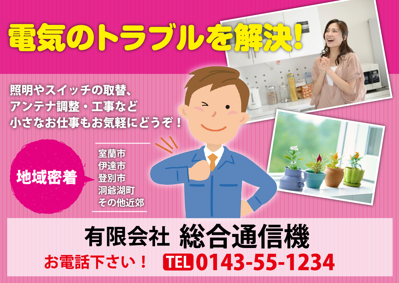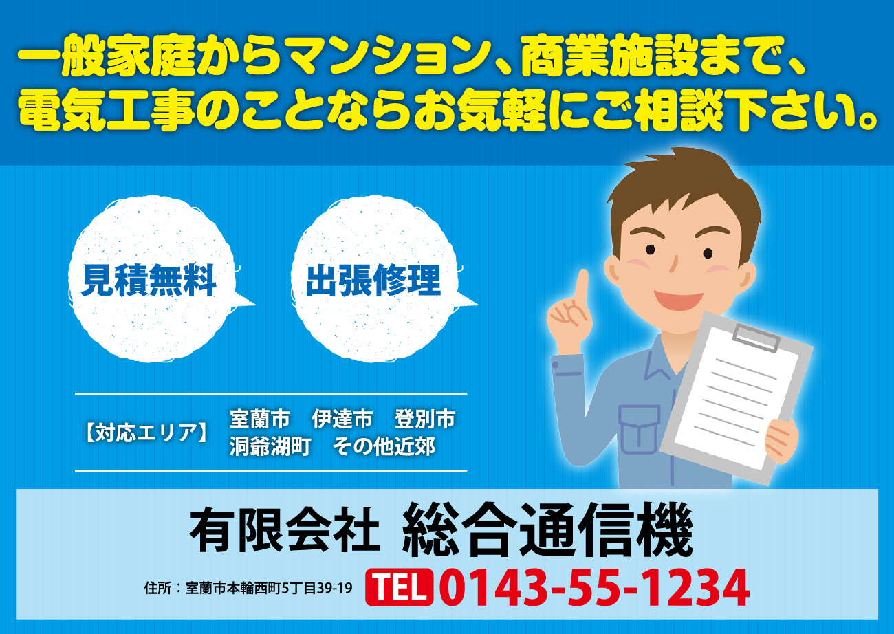 電気のトラブルは室蘭市を拠点に伊達市、登別市、洞爺湖町、他近郊をサポートする有限会社総合通信機におまかせ下さい!