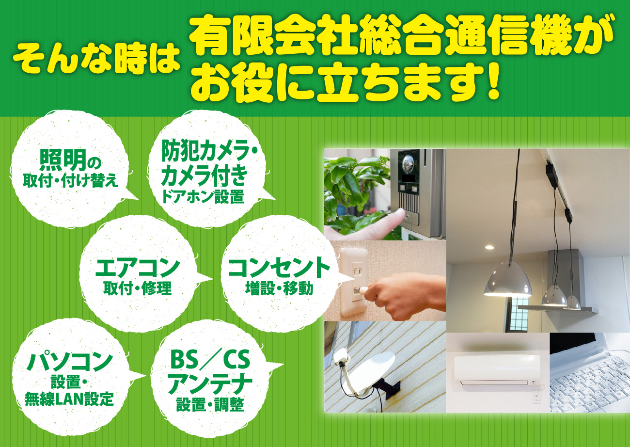 コンセント増設・移動工事/照明の取付・付け替え工事/BS、CSアンテナ設置・調整/防犯カメラ・カメラ付きドアホン設置/パソコン設置・無線LAN設定/各種家電販売・修理/エアコン取付・修理