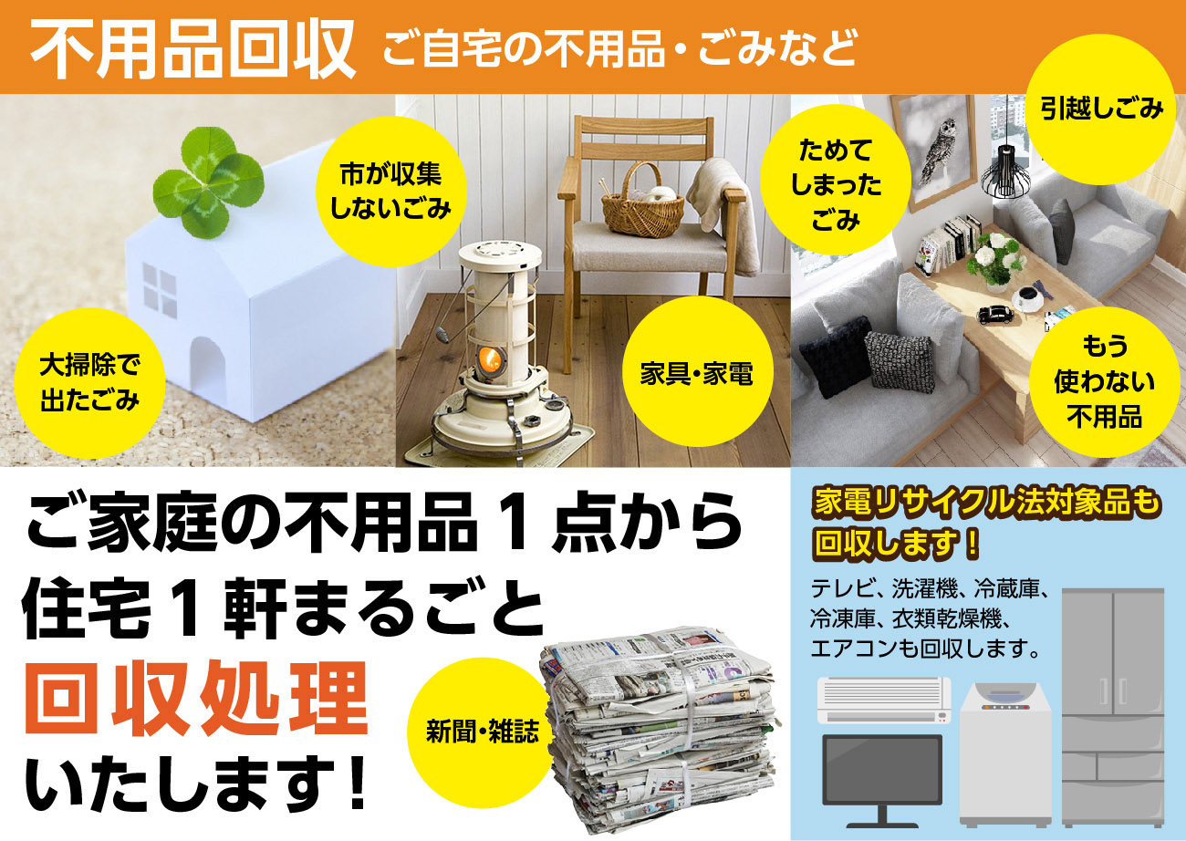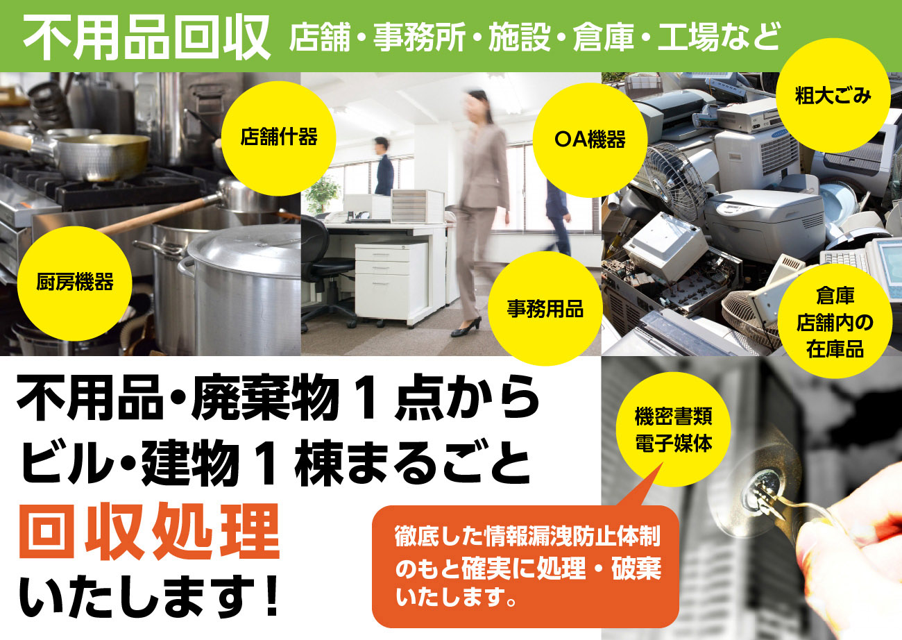 閉店、閉鎖、引越し、移転、規模縮小、改築、改装などで出る不用品、在庫品、ごみなどを回収・処理いたします。