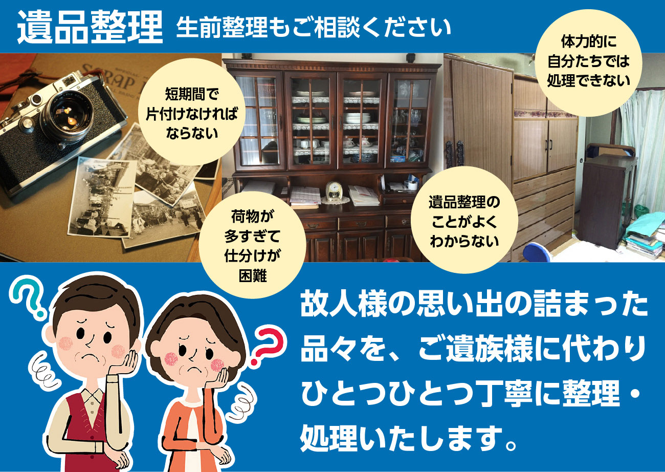 故人が生前大切にしていた品を整理、処理することは、ご遺族にとって精神的にも体力的にも大変な作業です。