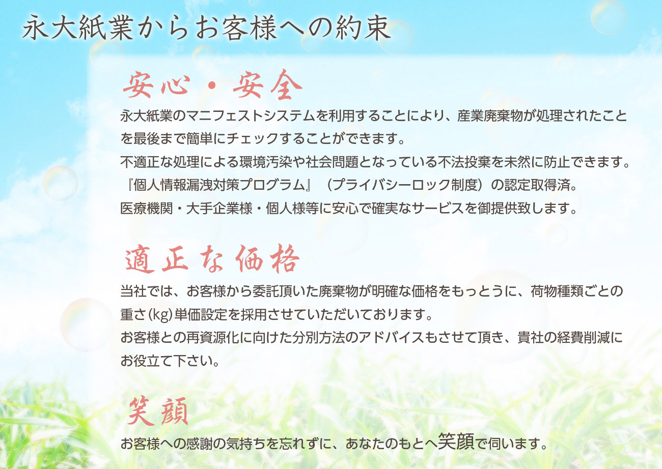 〈迅速対応〉〈低価格回収〉〈古紙高価買取〉〈プライバシー厳守〉など、