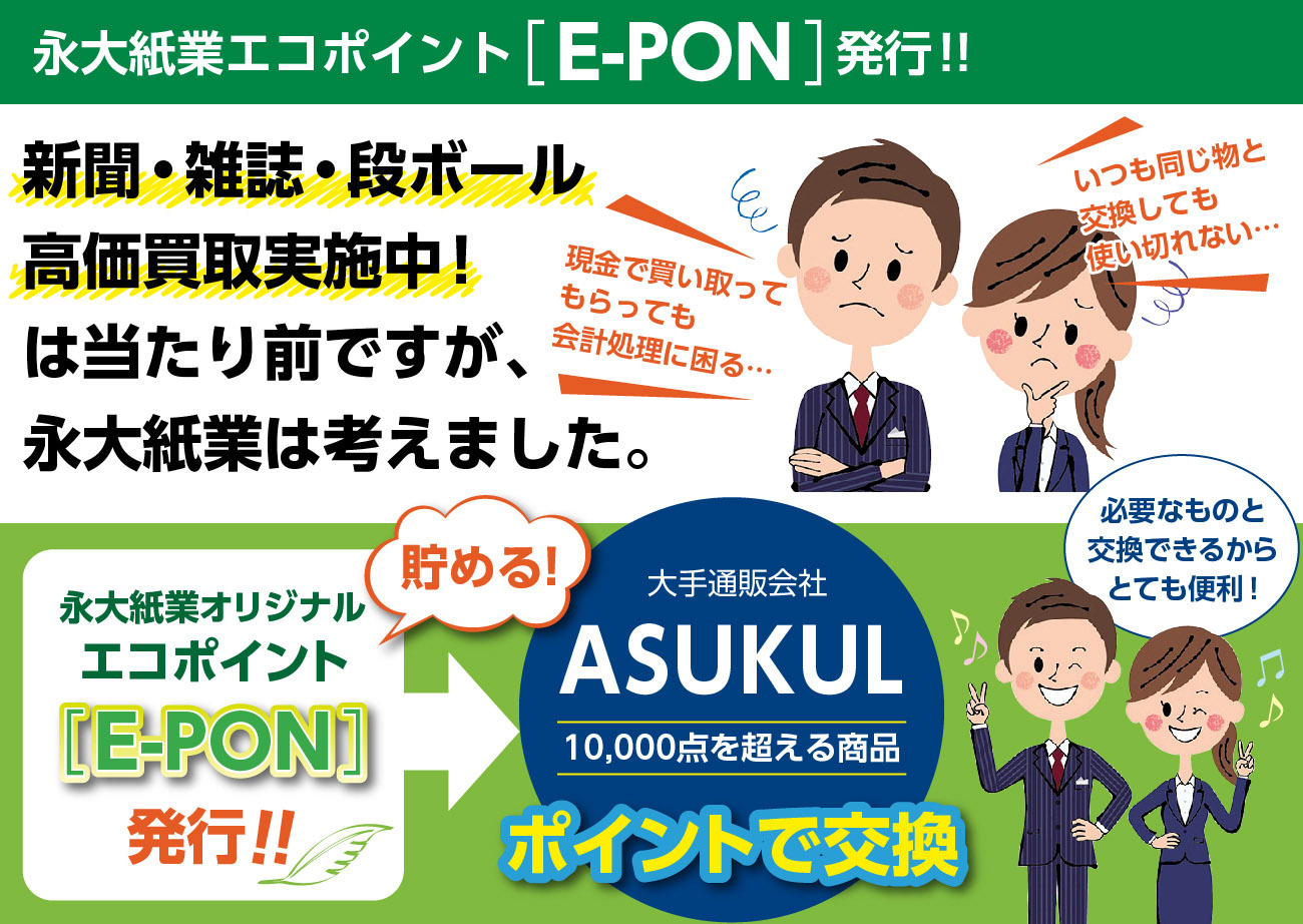 永大紙業は新聞、雑誌、段ボールの古紙回収時にオリジナルのエコポイント[E-PON]発行しています。