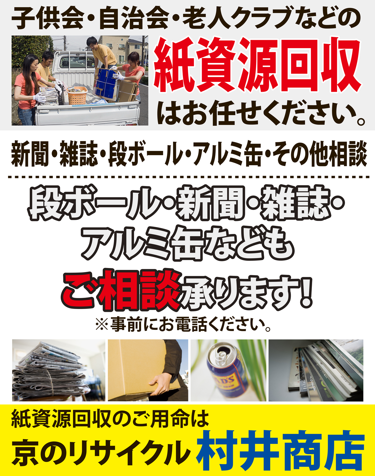 <回収エリア> ●京都府 京都市伏見区・宇治市・久御山町・八幡市・城陽市・宇治田原町・京田辺市・精華町・木津川市 ●大阪府 枚方市 ●奈良県 生駒市 京のリサイクル村井商店 TEL0774-62-2906 京都府京田辺市薪長尾谷43-1-203 代表者 村井 稔枝
