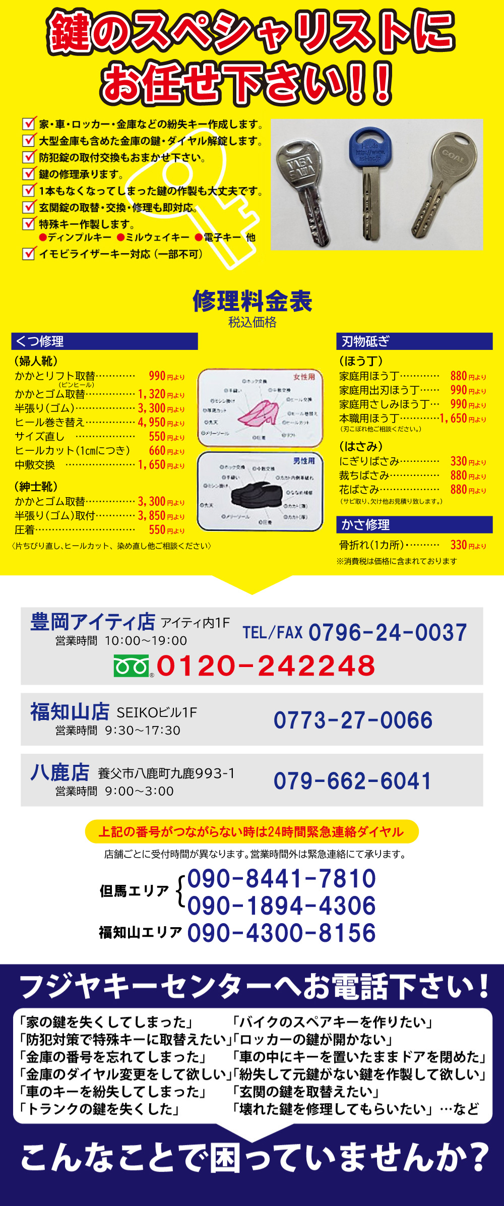 鍵の解錠・作製・修理・交換、カギのことならフジヤキーセンターにご相談下さい!