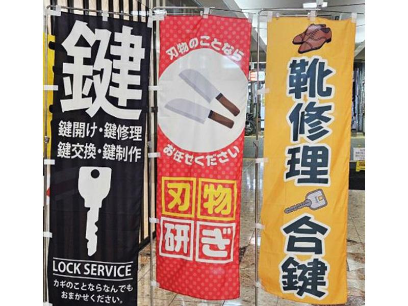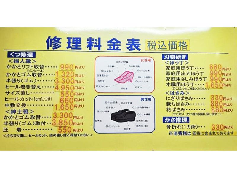 こんなこともお任せ下さい! ●くつ修理 紳士・婦人靴の修理もお任せ下さい。 靴底がすり減ったリフト(かかと)修理、半張りの取付・交換他 どのような靴にも対応しております。 ●はんこ(印鑑)販売 実印・銀行印・認印などの個人用印鑑から、 代表印・銀行印・角印などの法人用印鑑、 ゴム印、シャチハタまで様々な用途に応じた 印鑑を製作、販売しております。 ●刃物砥ぎ 切れなくなった包丁・ハサミの刃物砥ぎ承ります。 プロ用包丁の砥ぎ直し 型なおし・長さ調整・変形した包丁も承ります。 古い型のハサミで他店に断られてしまった… 長年使用してきた使い慣れた包丁が切れなくなった… など、お困りのときはお気軽にご相談下さい。