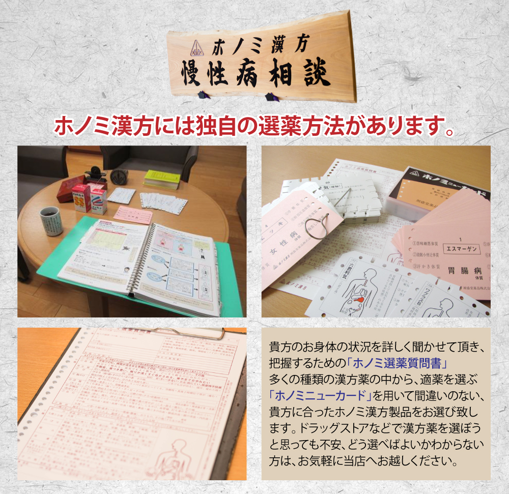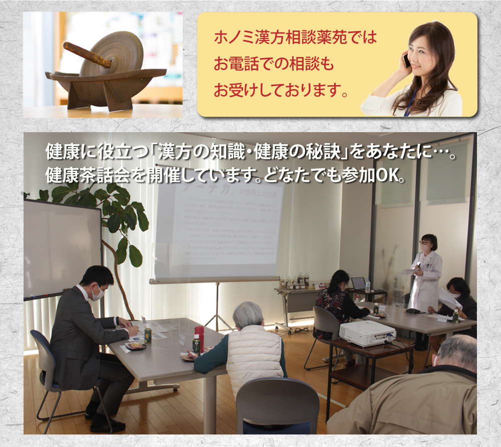 安心・安全を追求した弊社剤盛堂薬品独自の「ホノミ漢方製品」で、病気の回復・健康づくりのお手伝いをするホノミ漢方の直営相談店です。