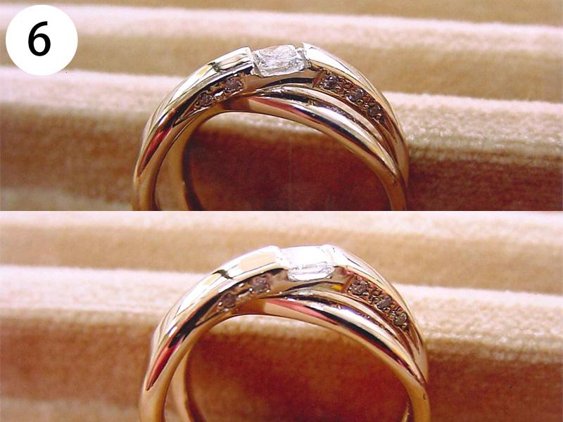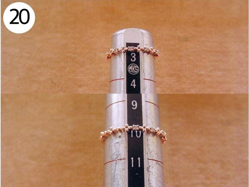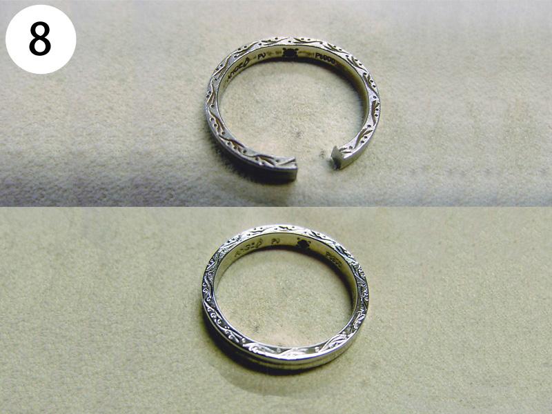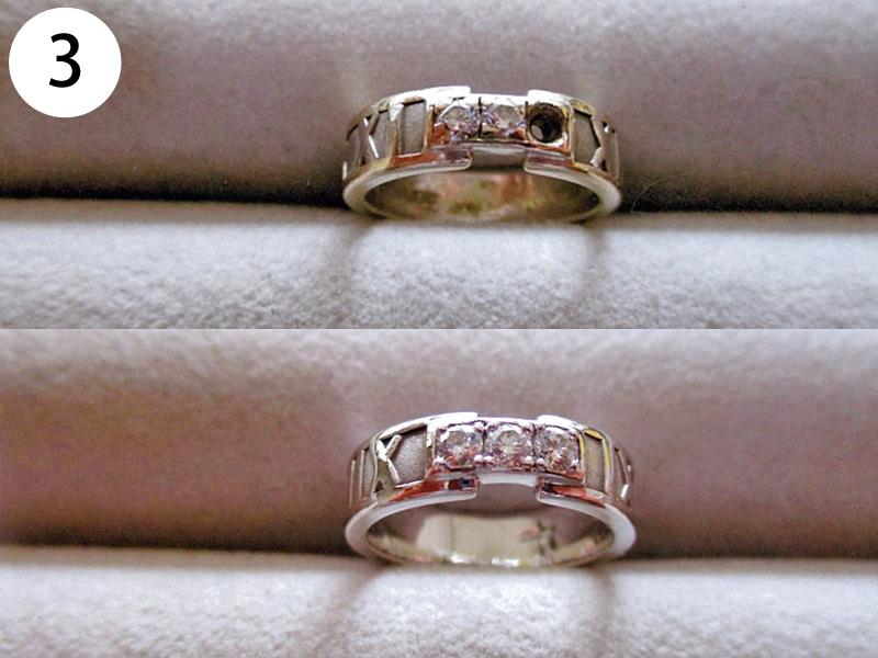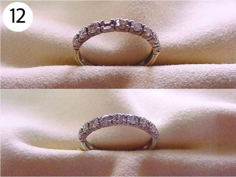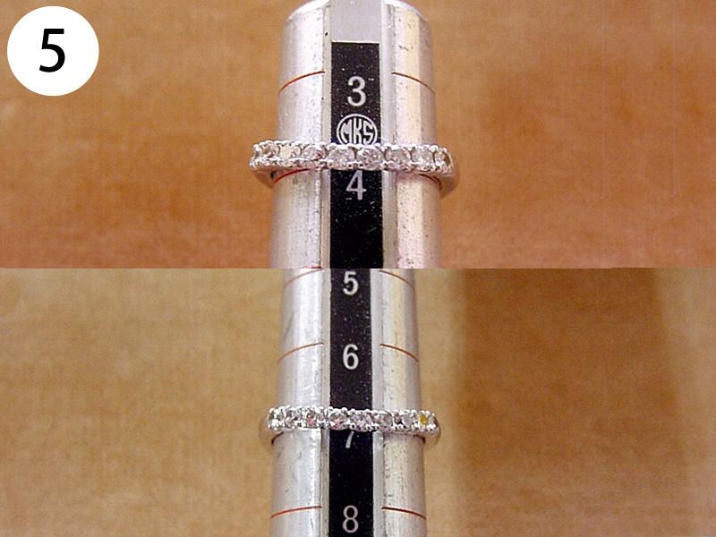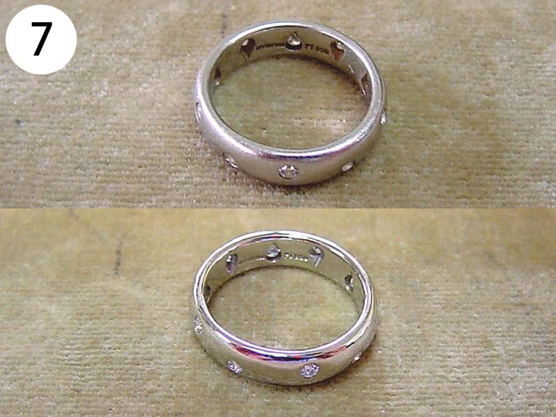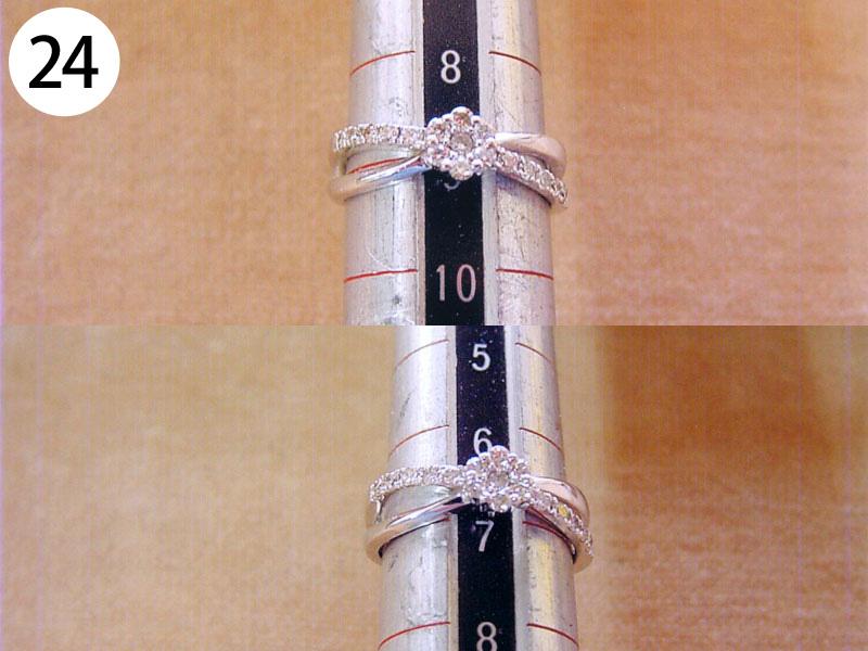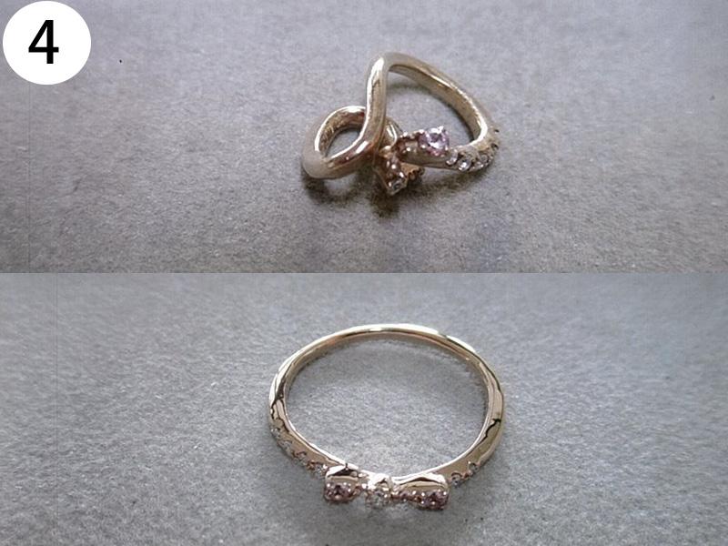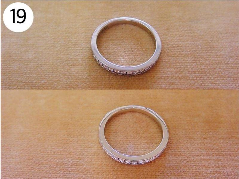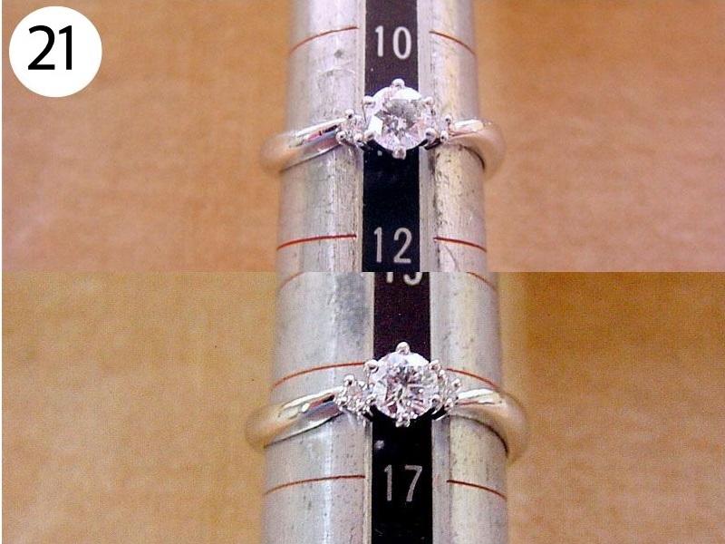 リング(写/上:Before 下:After) 1)ティファニーSV925アトラスリング サイズ直し地金を足して2サイズ大きく 3,960円 2)4℃ K10ホワイトゴールドリング 1サイズ小さく+ロジュームメッキ仕上げ 3,300円 3)ティファニーK18WGアトラスリング メレダイヤ爪12本全部立て直し+石留め+ロジュームメッキ仕上げ 22,000円 4)K10ピンクゴールドリング 破損修理 12,100円 5)ヴァンドーム青山Pt900ハーフエタニティダイヤリング サイズ直し4号→7号 3サイズ大きく 4,950円 6)K18 角ダイヤリング Before/ダイヤとリングの石座の大きさが合っていない為、石が留めれない状態。 After/石座の加工・石留め 16,500円 7)ティファニーPt950 ダイヤドッツリング 地金を足して2サイズ大きく 14,300円 8)Pt900 マリッジリング リングサイズ直し 2サイズ大きく 一部分デザインの彫り直し 4,400円 9)ティファニーK18ピンクゴールド リング リングサイズ直し 9号→12.5号 3.5サイズ大きく 4,400円 10)4℃ Pt950 マリッジリング 変形直し 新品仕上げ 2,200円 11)K18Pt900 コンビ マリッジリング サイズ直し 20号→22号 地金をコンビのまま足して2サイズ大きく 9,900円 12)Pt900 ダイヤハーフエタニティリング Before/爪4本がすり減っている為、ダイヤが留めれない状態 After/爪4本共立て直し修理 8,800円 13)4℃ K10シルバーコンビリング Before/爪がすり減っている状態 After/爪4本共立て直し修理 8,800円 14)ヴィヴィアンウエストウッド シルバーリング リングサイズ直し 10号→6号(トモ付け) 両サイドから2サイズずつカット 5,500円 15)ヴィヴィアンウエストウッド アーマーリング リングサイズ直し 指の根元側 2サイズ小さく 指先側 3サイズ小さく 4,400円 16)シルバー925 ターコイズリング リングサイズ直し 18号→17号 1サイズ小さく 3,300円 17)LSD シルバーリング リングサイズ直し 19号→14号 5サイズ小さく+いぶし仕上げ 3,300円 18)Pt900 リング 破損修理 4,400円 19)ティファニー Pt950 ハーフエタニティリング サイズ直し 15号→13号 2サイズ小さく 3,300円