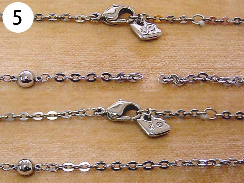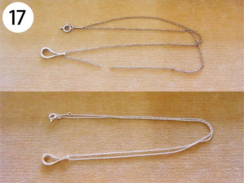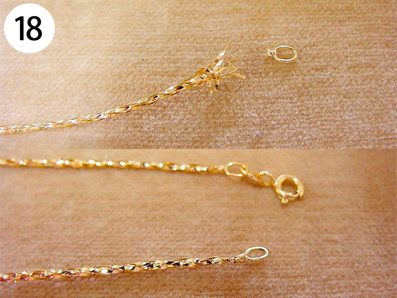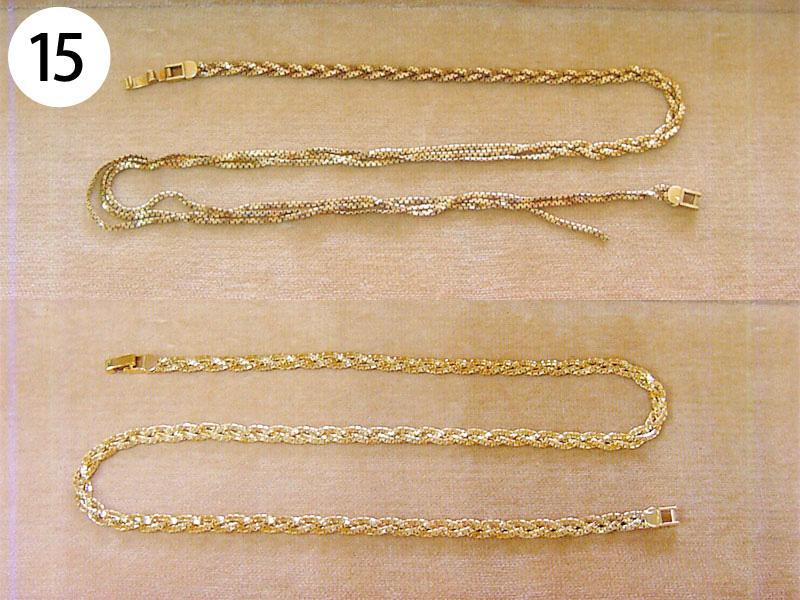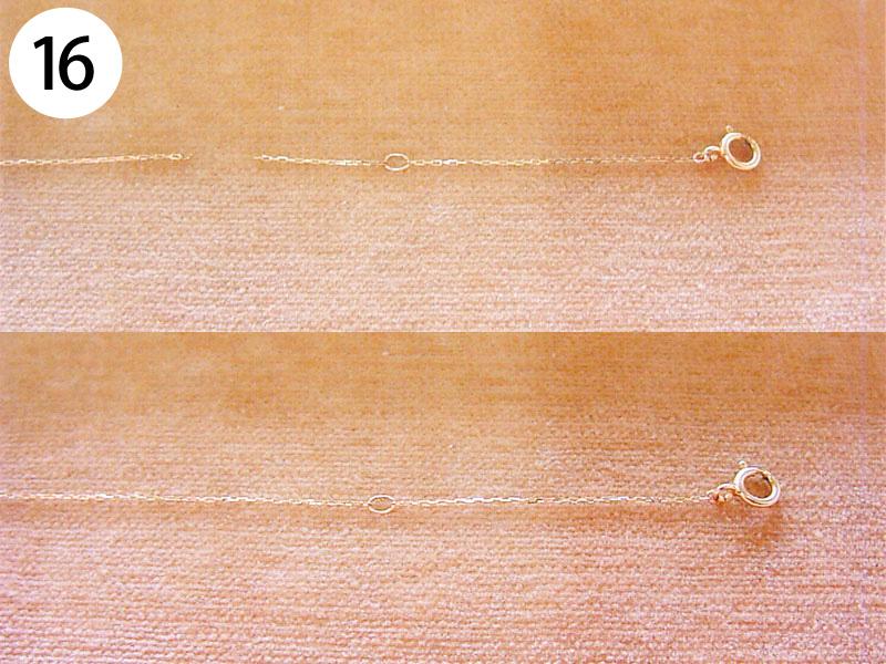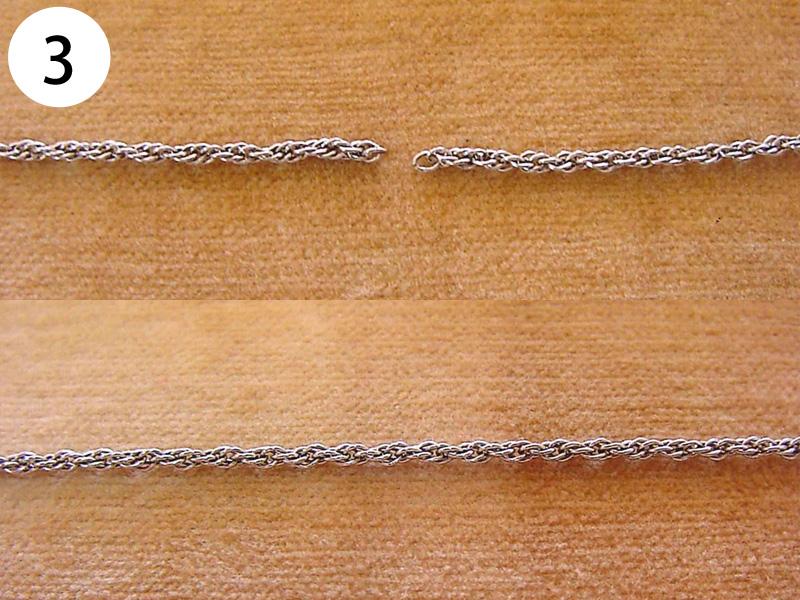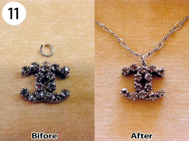 ペンダント・ネックレス(写/Before下:After) 1)スワロフスキーペンダントネックレス Before/カンがすり減って使えない状態 After/カンの補強修理+メッキ仕上げ 3,300円 2)Pt900 エメラルドペンダント 枠はずれ溶接修理 4,400円 3)シルバー925 縄状ネックレス 切れ直し溶接修理 1,650円 4)シルバー オメガチェーン Before/ネックレスが延びた状態 After/少しカットして溶接修理 3,300円 5)スワロフスキー メタルネックレス 切れ直し修理 溶接+ブラックメッキ 1,650円 6)チタン ワイヤー三連ネックレス 切れ直し修理 金具内部の座加工+溶接+メッキ 7,700円 7)銀メッキ ネックレス 切れ直し 溶接修理 1,650円 8)K24 ダイヤペンダント 変形直し+石の留め直し 再生修理 4,400円 9)金メッキ クリスタル ネックレス クリスタル3コいれ 接着修理 1,760円 10)象牙のネックレス ネックレス糸替え 2,200円 11)シャネル ブラックメッキ ペンダント バチカン部分溶接修理+ブラックメッキ仕上げ 1,650円 12)ヴィヴィアンウエストウッド オーブペンダントネックレス 折れ直し修理(ピューター素材) 溶接+メッキ仕上げ 5,500円 13)スワロフスキー ネックレス それぞれ 1コマはずし 1本 550円 14)グッチ シルバーネックレス 新品仕上げ+ナノコーティング 1,650円 15)K18 三つ編みネックレス ネックレス切れ直し修理 編み直し+溶接+磨き 3,300円 16)線経0.2m/m K10 極細ネックレス チェーンのコマ同士を固めずに溶接修理 1,650円 17)ティファニー SV925 ペンダントネックレス 溶接修理 1,650円 18)K18 ネックレス 溶接修理 3,300円 19)K18 オメガチェーン 溶接修理 4,400円