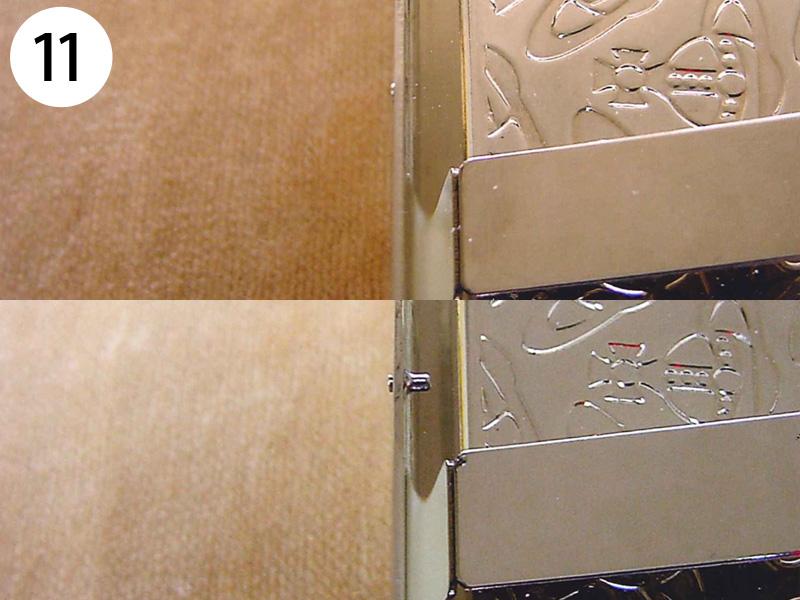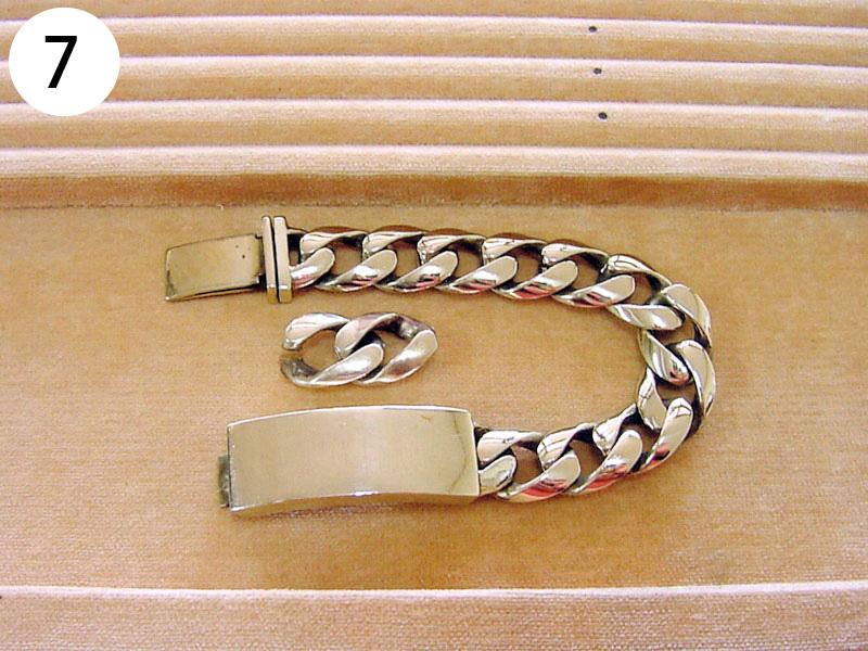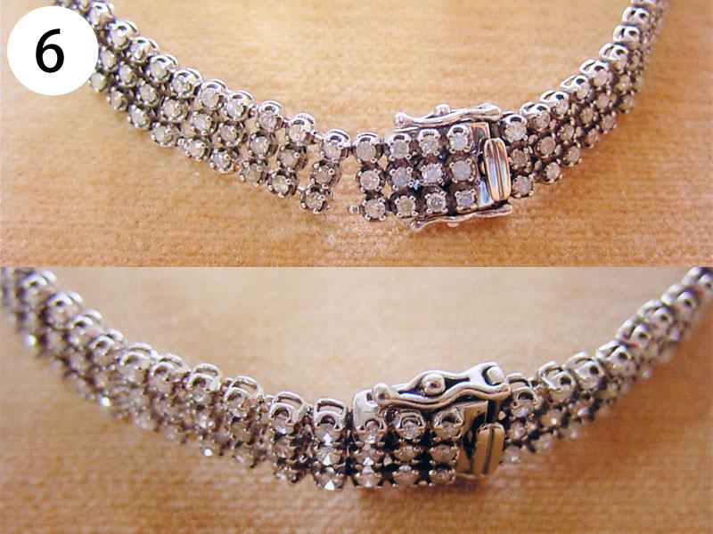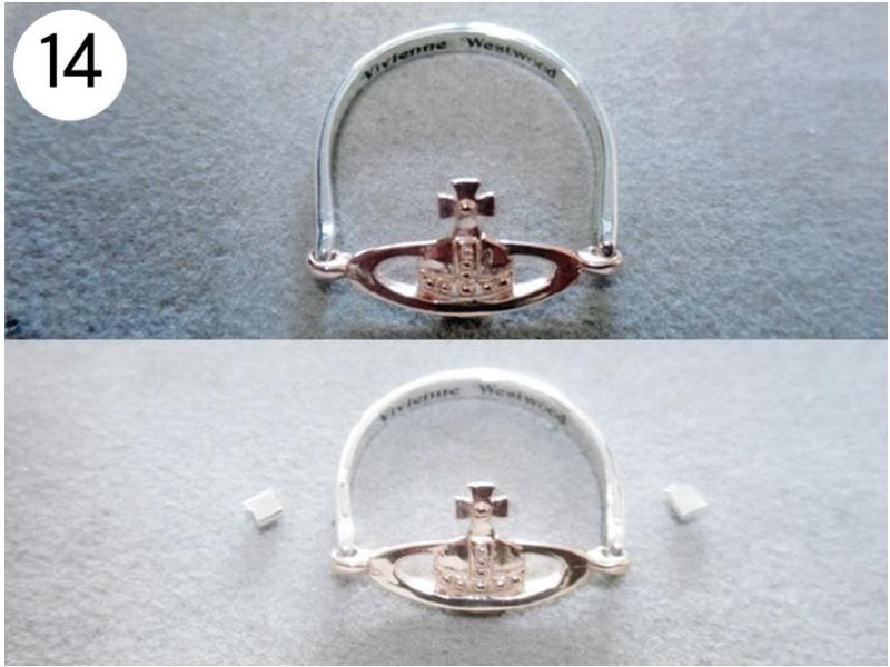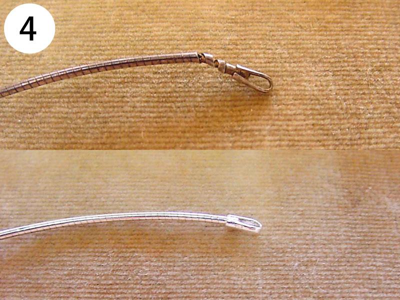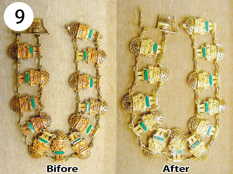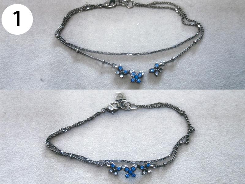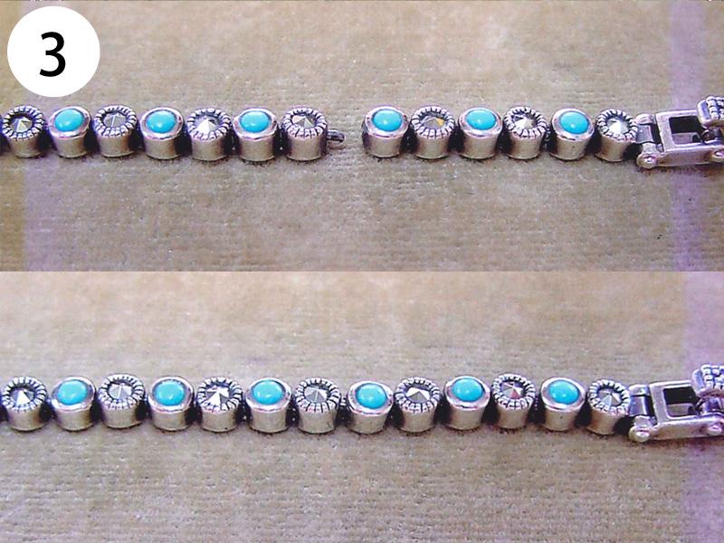 バングル・ブレスその他(写/上:Before下:After) 1)アナスイ クリスタルメッキブレス(ビューター) 溶接修理 3,300円 2)グッチ SV925 ボールブレス 2コマはずして溶接修理 3,300円 3)シルバー ターコイズブレス 芯折れ修理 芯の加工+動く状態での溶接修理 4,400円 4)シルバーブレス(エナメル) 2コマはずし+溶接+いぶし仕上げ 3,300円 5)K18 ボールチェーンブレスレット 短くカットして 溶接修理 3,300円 6)K14 ホワイトゴールド ダイヤテニスブレスレット コマ同士固めずに動く状態で溶接修理+ロジュームメッキ仕上げ 4,400円 7)ホワイトブラスブレスレット 2コマはずして 溶接修理 3,300円 8)金メッキバングル(ピューター素材) 溶接修理 4,400円 9)金ブレスレット 新品仕上げ 3,300円 10)グッチ ブレスレット 4玉はずして短かく チェーンカット 溶接修理 3,300円 11)ヴィヴィアンウェストウッド シガレットケース 留め金具のピン折れ修理 ピン加工+溶接+メッキ 4,400円 12)銀メッキ クリスタルのブローチ 針折れ修理 針の交換+溶接+メッキ 3,300円 13)コレットマルーフ シルバーヘアクリップ バネ折れ修理 バネの製作+交換修理 4,400円 14)シャネル 金メッキブローチ 針折れ修理+金メッキ 4,400円 15)K18 PG 馬蹄タイニーピン 変形直し+メレ穴部分地金埋め修理 4,400円