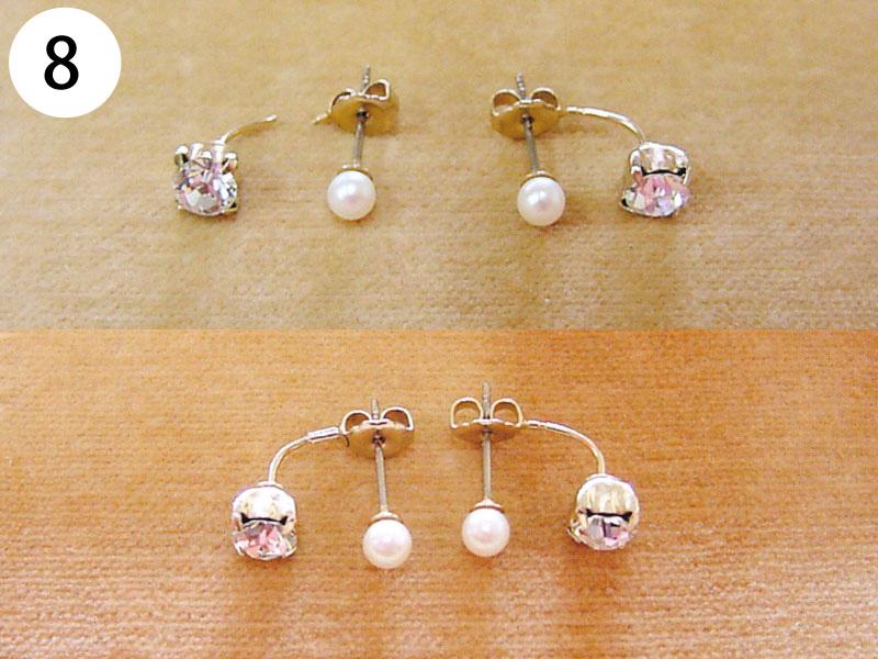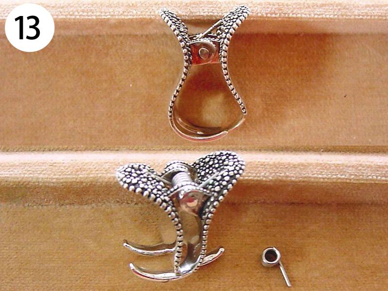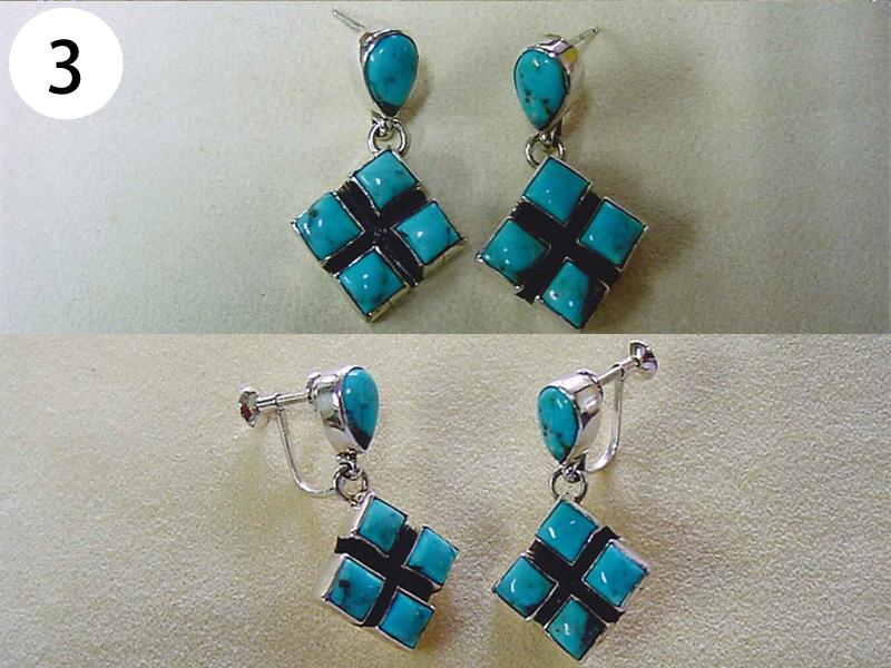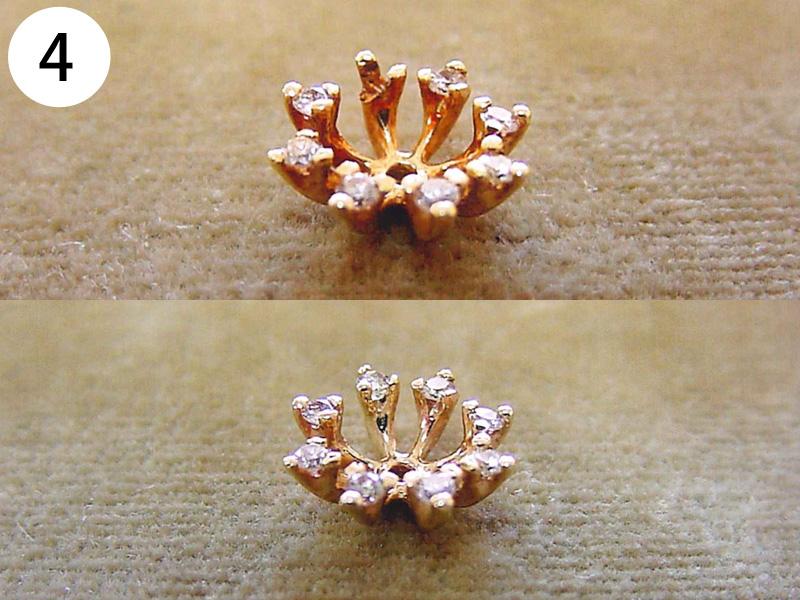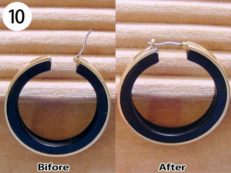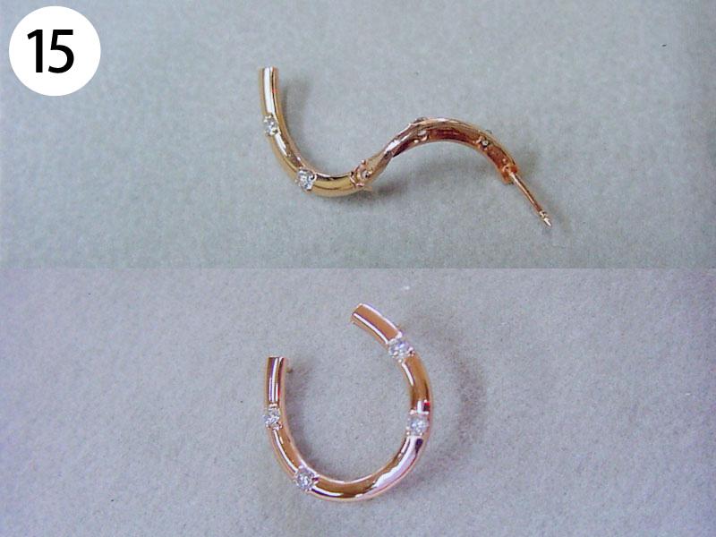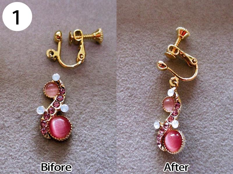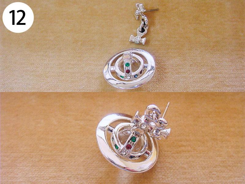 イヤリング・ピアス(写/上:Before 下:After) 1)金メッキクリスタルイヤリング(ピューター素材) 折れ修理 溶接+金メッキ 3,300円 2)金メッキイヤリング イヤリングをピアスに加工 金具代+溶接+金メッキ 6,600円 3)シルバー925 ターコイズピアス ピアスをイヤリングに加工 金具代+溶接代 6,600円 4)K14ダイヤピアスチャーム Before/ダイヤ紛失・爪折れ修理 After/爪の立て直し+石合わせ+石留め 6,600円 5)クリスタル メッキピアス イヤリングに加工 金具代+溶接代 6,600円 6)合成石 銀メッキピアス ポスト折れ直し 溶接修理 3,300円 7)シャネル メッキピアス ピアスをイヤリングに加工 金具代+溶接代 6,600円 8)クリスタル メッキピアス ポスト折れ修理 パイプを付けて補強 溶接修理 3,300円 9)スワロフスキー クリスタルピアス ピアスをイヤリングに加工 金具代+溶接代 6,600円 10)樹脂付金メッキ フープピアス パーツ加工 溶接修理 4,400円 11)シャネル 金メッキイヤリング エナメル系樹脂入れ 1,100×2=2,200円 12)ヴィヴィアンウエストウッド オーブピアス 折れ修理(ピューター素材) 溶接+メッキ仕上げ 5,500円