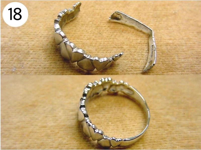 20)ノジェス K10 ピンクゴールドリング サイズ直し 3号→10号 7サイズ大きく 5,610円 21)Pt950 ダイヤリング リングサイズ直し 11号→16.5号 5.5サイズ大きく 5,280円 22)金メッキリング(ピューター&真鍮) 折れ部分溶接修理+金メッキ+樹脂入れ 4,950円 23)イオッセリアーニ K18 リング サイズ直し 11号→9号 2サイズ小さく 3,300円 24)K10 ホワイトゴールドリング リングサイズ直し 9号→7号 2サイズ小さく+ロジュームメッキ仕上げ 3,300円 25)真鍮 金メッキリング 3本とも 新品仕上げ+下地メッキ+金メッキ仕上げ 2,200×3=6,600円 26)グッチ 750 リング リング破損再生修理 4,400円 27)K10 ピンクゴールドリング サイズ直し 7号→9.5号 2.5サイズ大きく 3,080円 28)chigo(チーゴ)シルバーK10ピンクゴールドリング サイズ直し 13号→10号 3サイズ小さく+ピンクゴールドメッキ仕上げ 4,400円 29)K18 ルビーリング サイズ直し 7号→3号 4サイズ小さく 2,200円 30)ジャスティンデイビス シルバーリング リングサイズ直し 5号→3号 2サイズ小さく 3,300円 31)SV925 エナメル系樹脂入りリング サイズ直し 15号→19号 4サイズ大きく 4,620円