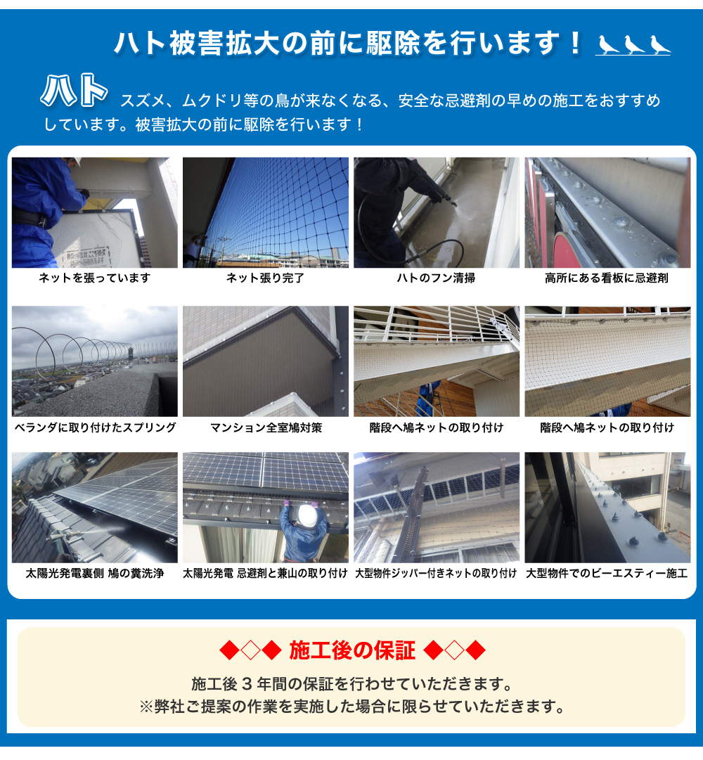 ハト、スズメ、ムクドリ等の鳥が来なくなる、安全な忌避剤の早めの施工をおすすめしています。