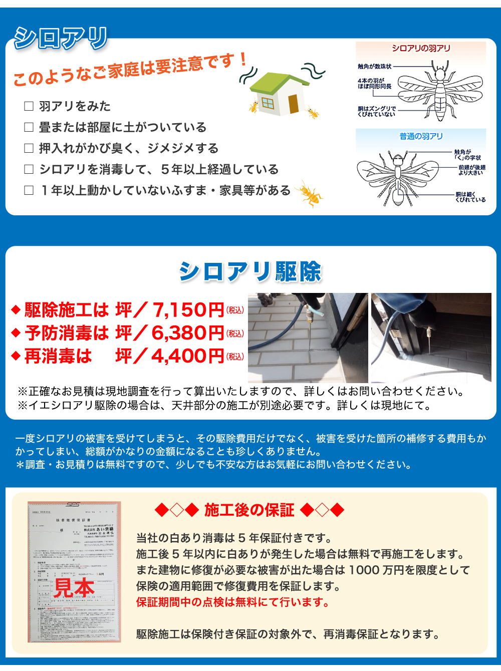 施工後5年以内に白ありが発生した場合は無料で再施工をします。