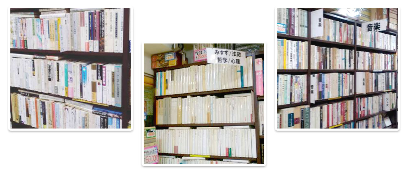 神保町の真ん中、4店舗目にあります澤口書店東京古書店の社長が直接全国に出張して一冊一冊の本の【価値】を丁寧に拝見させていただきます。また、他社で取り扱いの無い「ISBNコード」や「バーコード」が無い古書や蔵書印・ラベル貼付の廃棄本でも問題ありません